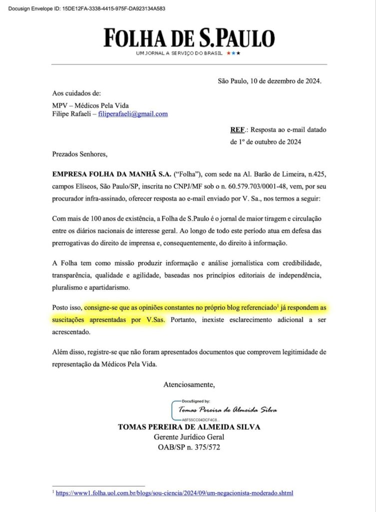 Essa história pode ser lida em detalhes aqui: Checagem: leia a surpreendente resposta do jurídico da Folha de S. Paulo ao MPV – Médicos Pela Vida